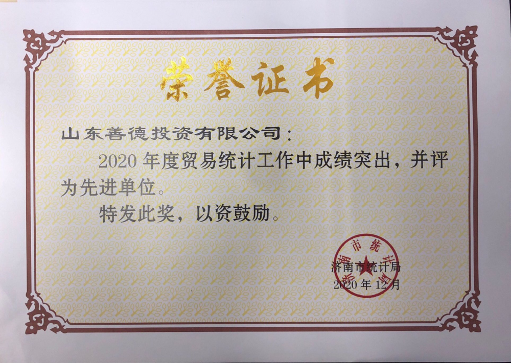 善德公司榮獲“2020年度貿(mào)易統(tǒng)計(jì)工作先進(jìn)單位”