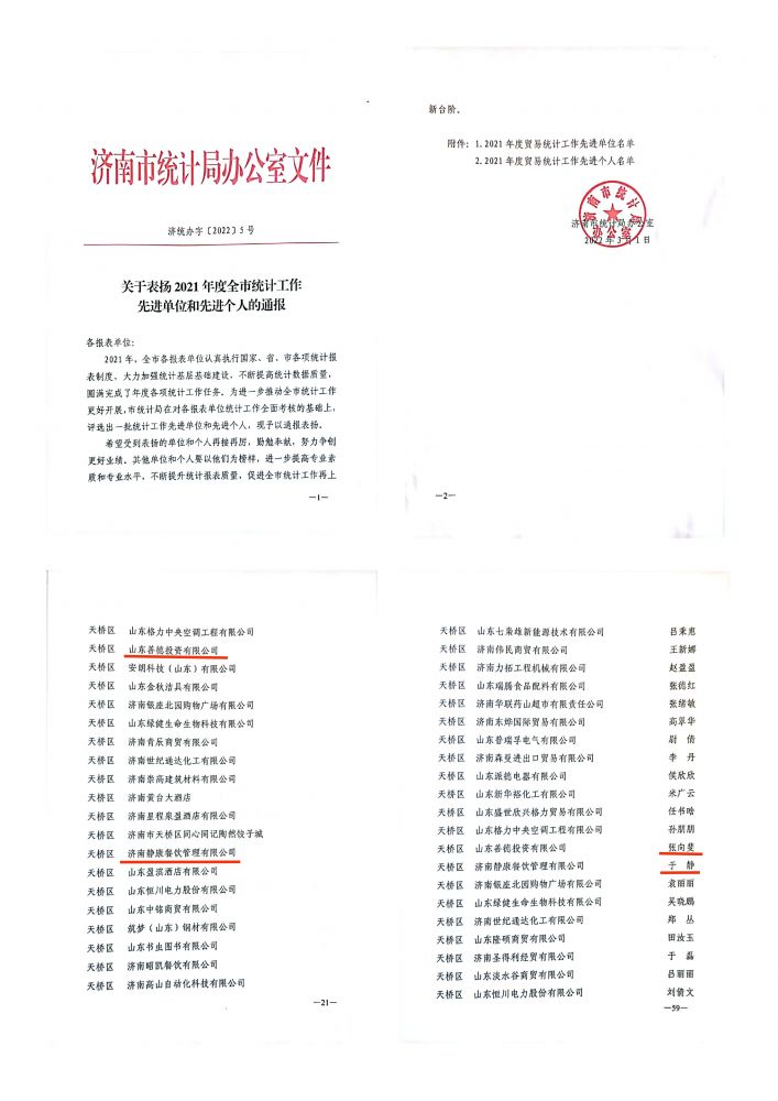 近日,濟南市統(tǒng)計局印發(fā)了《關(guān)于表揚2021年度全市統(tǒng)計工作先進單位和先進個人的通報》,山東善德投資有限公司及其子公司濟南靜康餐飲管理有限公司均被授予“2021年度全市統(tǒng)計工作先進單位”榮譽稱號。公司財務(wù)部張向斐、于靜獲得“2021年度全市統(tǒng)計工作先進個人”榮譽稱號。