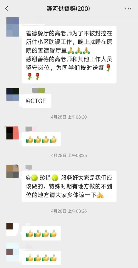 臨近“五一”假期,疫情防控形勢更加嚴(yán)峻,醫(yī)院開始實(shí)行閉環(huán)管理,濱河餐車供餐服務(wù)暫停,善德餐廳緊急研究決定外賣送餐服務(wù),學(xué)生們只要提前在線上微餐廳下單,餐廳就會在就餐時間點(diǎn)準(zhǔn)時送到,每天能夠保障100余人用餐需求。高曙峰再一次承擔(dān)起了濱河外賣送餐的任務(wù),由于部分同事被封控在家,人手嚴(yán)重不足,為了不被封控在家無法到崗,高大哥主動申請留店,堅(jiān)持每日準(zhǔn)時送餐。他用實(shí)際行動和堅(jiān)守詮釋了善德人的擔(dān)當(dāng)和勇氣,他的付出和奉獻(xiàn)也得到了大家的夸贊。