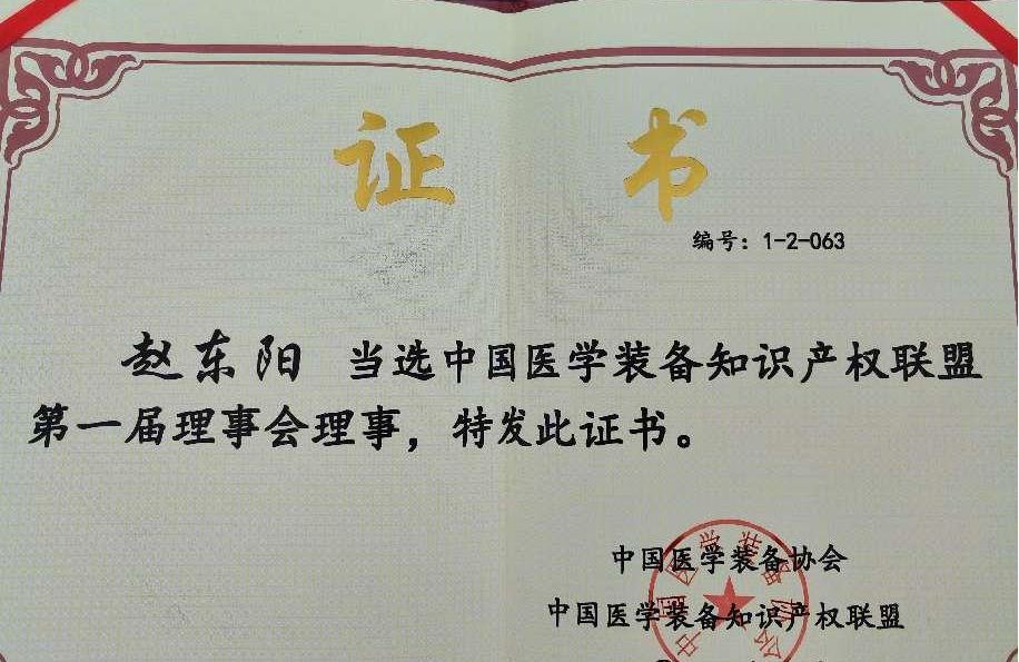 趙東陽當(dāng)選中國醫(yī)學(xué)裝備知識產(chǎn)權(quán)聯(lián)盟第一屆理事會理事