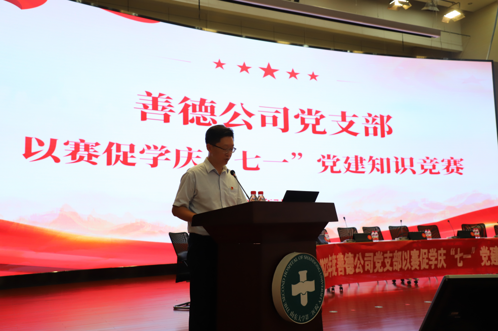 為慶祝中國共產(chǎn)黨成立102周年,推動學習貫徹習近平新時代中國特色社會主義思想主題教育走深走實,進一步鞏固理論學習成果,增強公司全員綜合能力,營造“趕學比超”的學習氛圍,7月21日上午,善德公黨支部組織開展慶“七·一”黨建知識競賽。山大二院黨委宣傳部部長、新聞中心主任袁玉起,山大二院第二黨總支組織委員、感染管理部副主任卞軍平,公司董事長李延鵬,公司支部書記、總經(jīng)理喬龍,公司副總經(jīng)理韓晗出席活動。