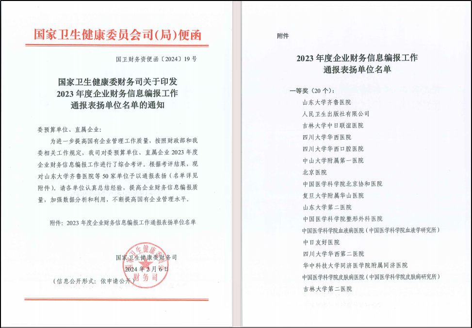 近日,國家衛(wèi)生健康委對(duì)2023年度企業(yè)財(cái)務(wù)信息編報(bào)工作成績突出的預(yù)算單位予以通報(bào)表揚(yáng),公司榮獲一等獎(jiǎng)。