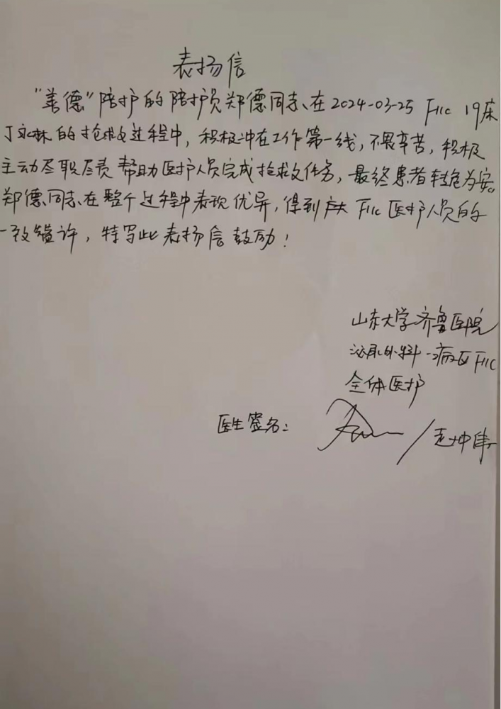 經(jīng)過連續(xù)一個(gè)多小時(shí)的手術(shù)緊急搶救,患者生命體征終于平穩(wěn)轉(zhuǎn)危為安。本該下班休息的鄭德,但是考慮到患者剛下手術(shù)臺(tái),家屬情緒還未平復(fù),他還是放心不下,又幫助往返藥房取藥,并陪同家屬將患者從手術(shù)室安全轉(zhuǎn)運(yùn)至ICU,再一次安撫了家屬情緒,并做了詳細(xì)全面的交接后才離開。等回到科室已經(jīng)快晚上九點(diǎn)了,一下午沒顧上喝水吃飯的他,在身體從緊張的狀態(tài)抽離后才感覺口干舌燥、既餓又累。鄭德當(dāng)日專業(yè)貼心的服務(wù)也獲得了科室主任和醫(yī)護(hù)人員的贊許,并以科室名義寫信給予表揚(yáng)。